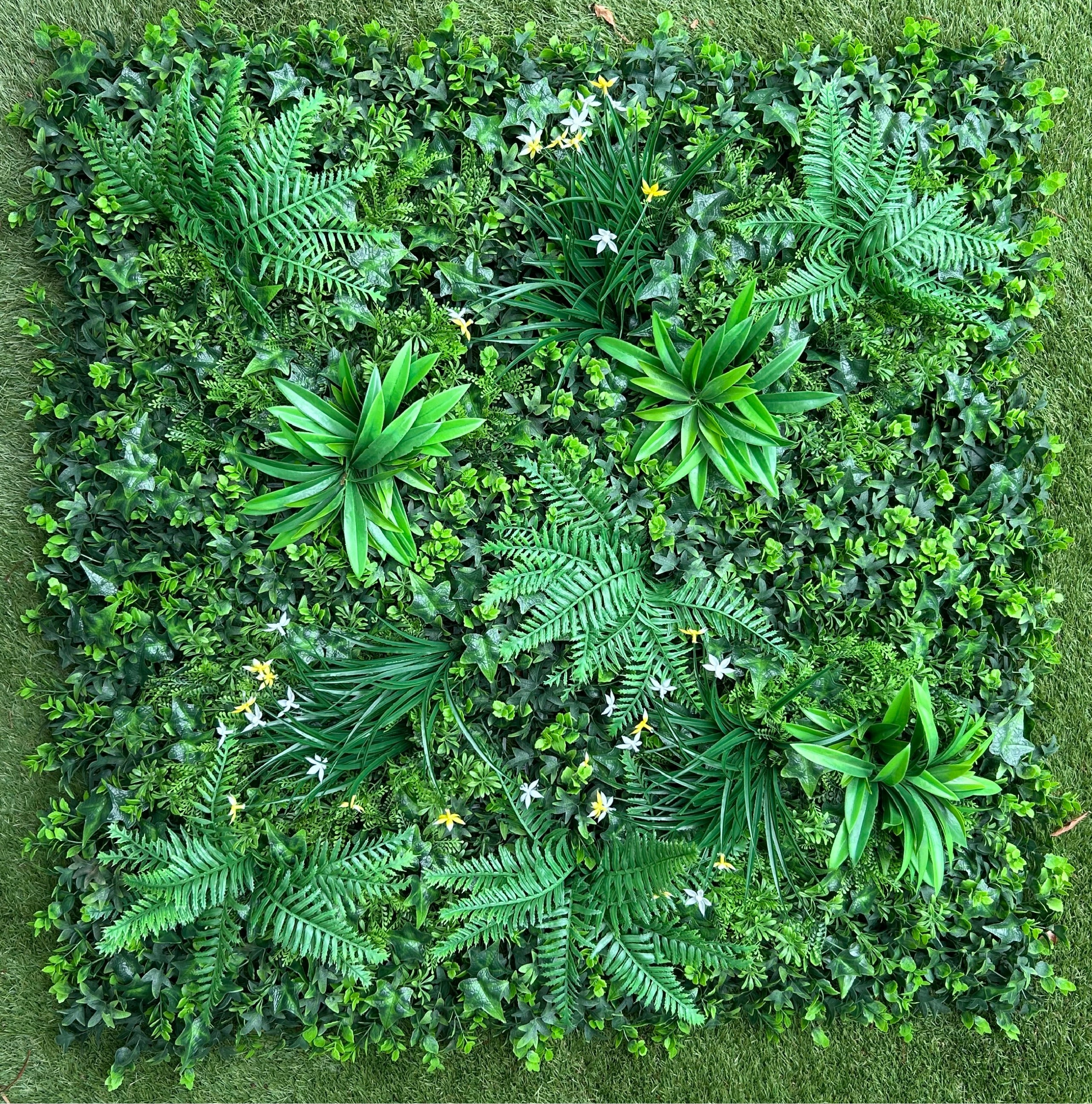 Green Fields is a dense, balanced mix of foliage styles with softer leaf forms and subtle daisies throughout. The layout feels full and settled, giving the impression of an established planted wall rather than a patterned panel.